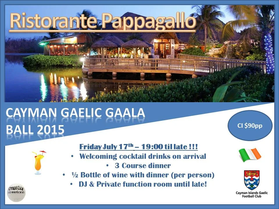 Please see below flyer with details of the upcoming Annual GAALA Ball on Friday 17th July at Ristorante Pappagallo. This is an invite for all club members (past and present) in what promises to be a great end to another great season for the Gaelic Football Club here in Cayman.